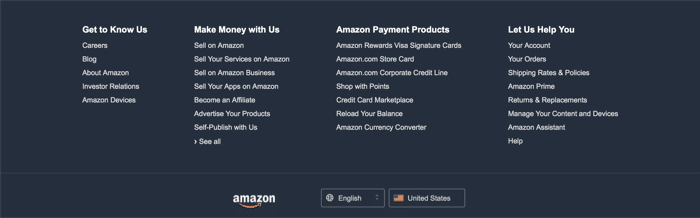 Amazon puts all of its corporate information in the footer of its page. This allows their products to take precedence but keeps the links on the page so they’re still accessible.