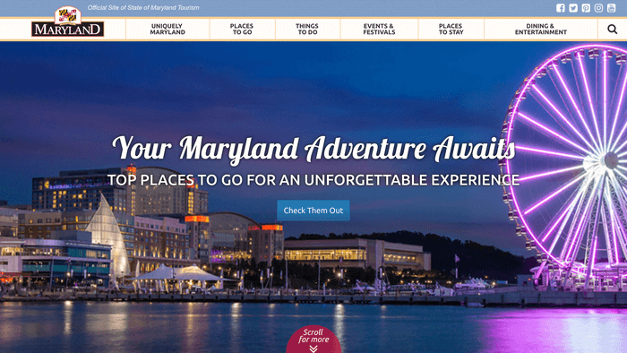 Maryland’s tourism page boasts unforgettable experiences and immersive photography.
