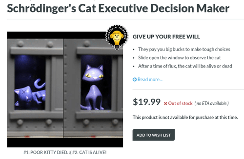 While their products are largely novelties, the GeekLab designers think deeply about them and ask the tough questions they know their audience would ask. In the case of one product – their Schrodinger’s Cat Executive Decision Maker – this prompted merchandiser Ty Liotta to ponder,