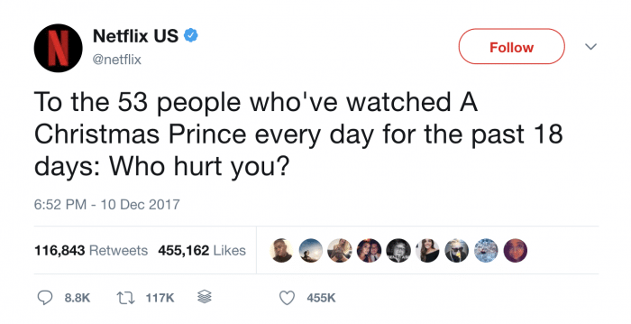 Netflix followed a similar strategy that Spotify did, using the end of the year combined with statistics to poke fun at their customers.