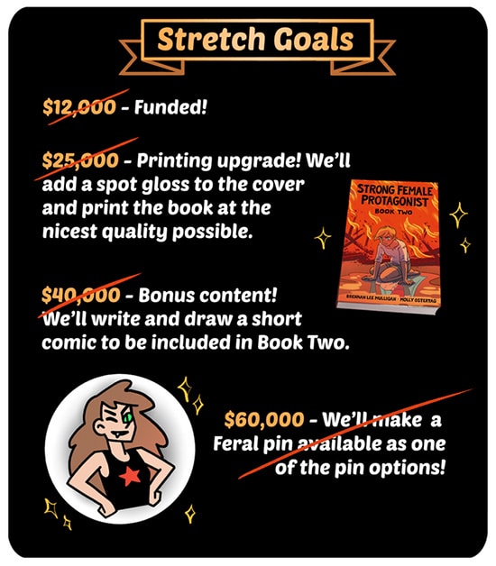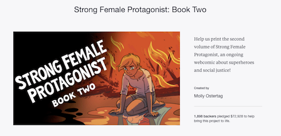 The Kickstarter campaign for the second print book of the webcomic Strong Female Protagonist provides an excellent example of a unique and cohesive campaign design. All of the graphics for the campaign are drawn in the same style as the comic itself. The headers, rewards, and stretch goals graphics all share a similar color scheme with the cover of the book itself. Every visual included on their campaign page looks like it belongs with the rest.
