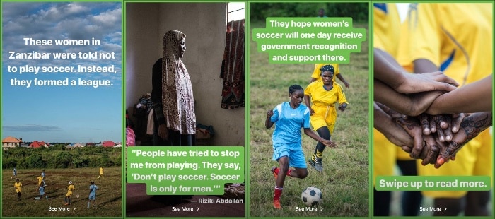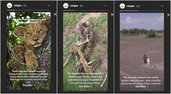 The stories don’t end on Instagram, though. @NatGeo takes excellent advantage of the ability to “swipe up” on Stories, which sends users on to more in-depth reporting and articles on its website.