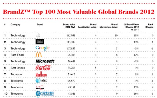 First, great products and services are critical to building a strong brand. Apple, for the second year in a row, is the world’s leading brand. According to the BrandZ 2012 rankings, Apple increased its brand value by 19 percent this past year – to $183 billion (37 percent of Apple’s market capitalization). This was extraordinary – especially since its visionary founder, Steve Jobs, died last year.