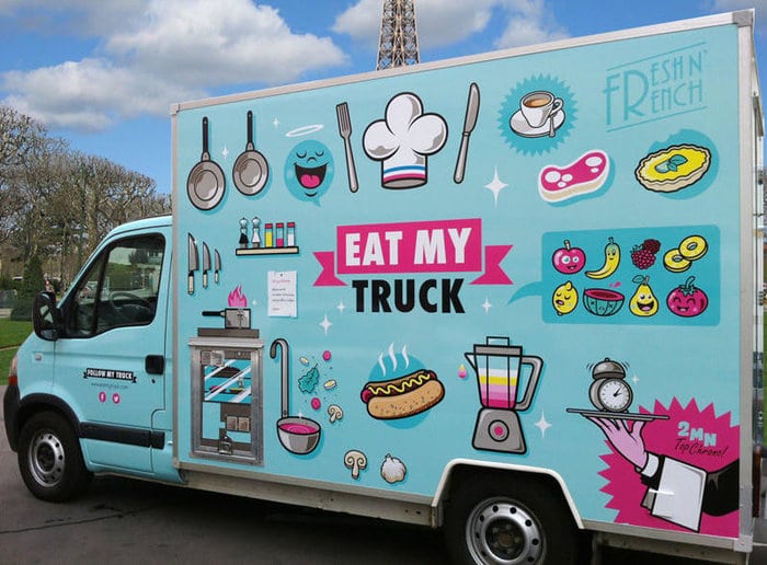 It’s in your business’s best interest to adopt bold and unique colors to represent your brand. Strong color choices (like the neon shades on the Oh My Gogi! truck above) catch the eye – and that’s precisely what you want.