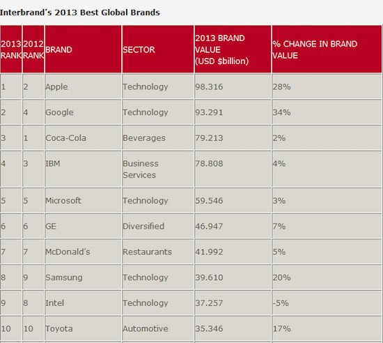 Interbrand, a corporate identity and brand consulting company, just released its 2013 Best Global Brands report. Apple has unseated Coca-Cola as the top global brand. Coca-Cola dominated the top spot for the past 13 years.