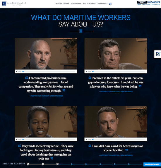 For example, take a look at how Arnold & Itkin LLP, a law firm focusing on maritime law, emphasizes client testimonials on their homepage.