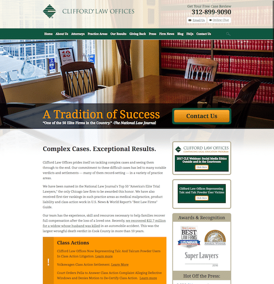 Take a look at how Clifford Law Offices, a Chicago-based personal injury law firm, organizes its site using the navigation menu.