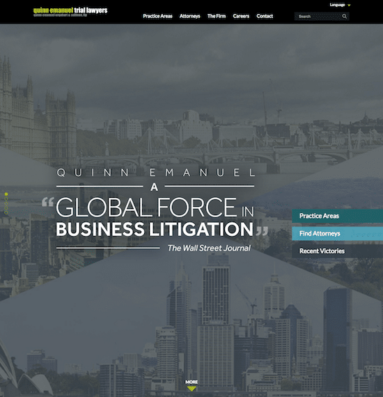 Content can also support navigation. For example, take a look at how Quinn Emanuel, a successful trial law firm, keeps its homepage clean, simple, and focused. The secondary navigation (to the right) emphasizes the most important information that prospective clients want to know when they visit a law firm site: what do they do, who the attorneys are, and is the firm successful?