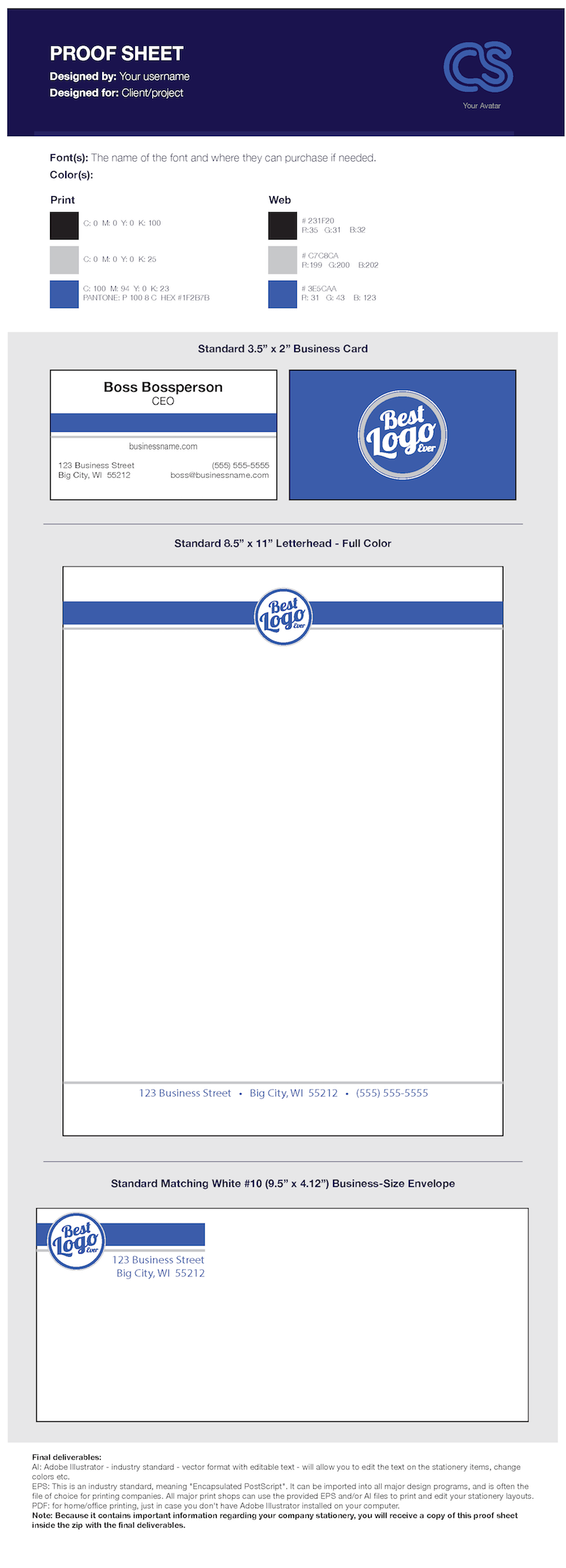 We created a common proof template for logo projects and we encourage each designer to use it. It will help clients to better understand colors and variations on the logo, and will help you create professional proof files.
