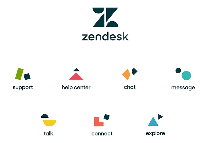 Zendesk uses geometry in unique ways, branding its various products with complementary geometric branded symbols.