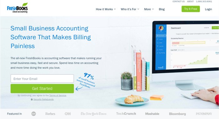 Freshbooks’ website (pictured above) reassures customers in several ways. They list the reputable press organizations that have featured their service and include a link to their security safeguards beneath their call to action field. They also claim that 97% of small business owners recommend their services.