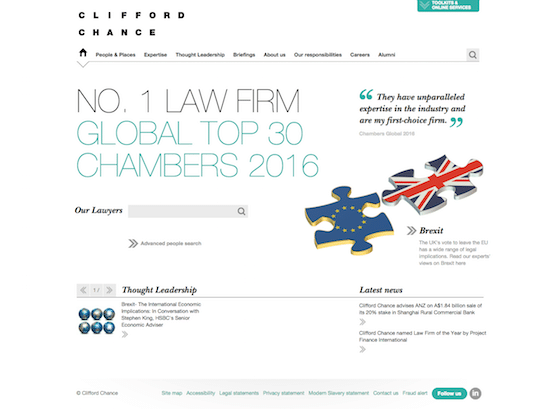Even big firms strive to keep things simple and focused. Take a look at how Clifford Chance focuses on a few core things in its Hero area. But notice how their Hero is less readable and not nearly as crisp as the two examples above.