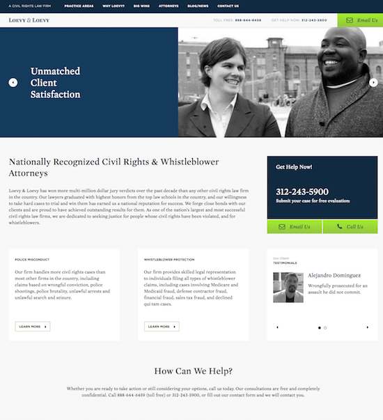 For example, Loevy & Loevy is a successful civil rights & whistleblower firm. When you visit their homepage, it’s pretty clear that they focus on civil rights and whistleblower cases. This is reinforced throughout the homepage design (and on other pages). In fact, “A Civil Rights Law Firm” is left of the main header navigation, right above their logo, to provide further emphasis.