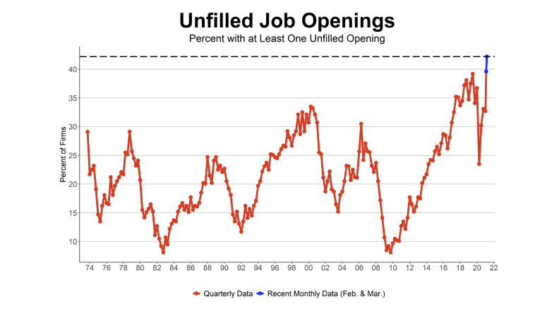 The National Federation of Independent Business reported that 42% of business owners had job openings that could not be filled, which is a record high.