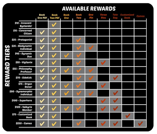 These changes could include new stretch goals (new financial goals along with accompanying promises of expanded features) and new rewards. Tiered rewards are a key component to a crowdfunding campaign; incentivizing backers to make donations of increasing amounts in exchange for exclusive rewards. Updated graphics outlining the details of these goals and rewards are a must.