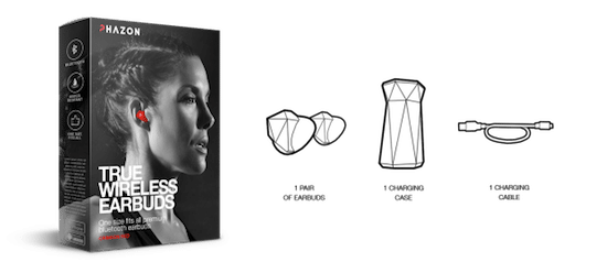 Phazon shared professional, well-lit images of the earbuds, as well as the earbud charging case. They also included images of the earbuds being worn while athletes participate in a wide range of sports activities, putting their claim that their earbuds won’t fall out under any circumstances up front and center. On top of that, they included graphic renderings of the earbuds, charging case, and cable; and a 360° 3D model of their earbuds.
