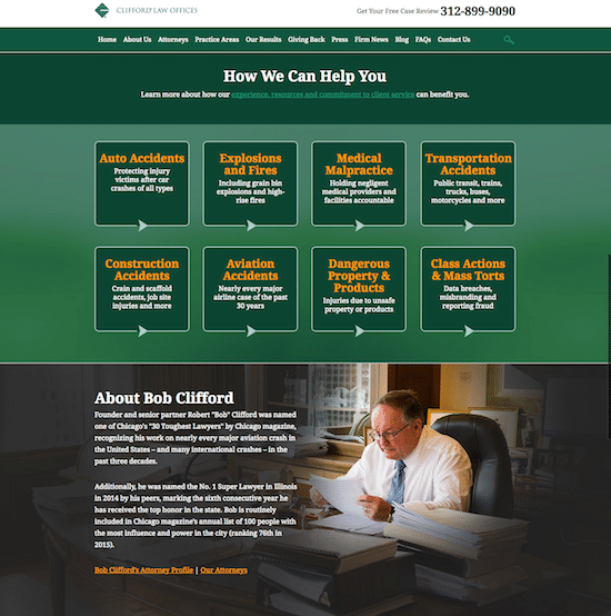 Take a look at how Clifford Law Offices, a Chicago-based personal injury law firm, organizes its site using the navigation menu.