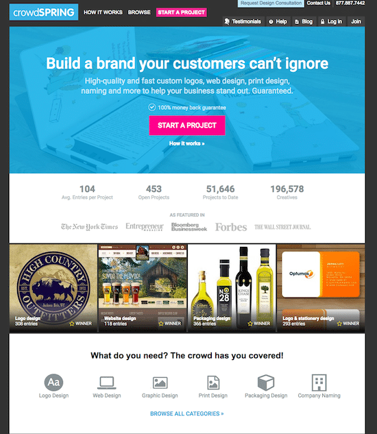 You should consider a few important factors when you design your CTA, including (a) location (above the fold – visible on the monitor when the page first loads is typically ideal), (b) make sure the CTA stands out from the other content on your site (notice how the crowdspring “START A PROJECT” CTA is pink?), (c) create a link to another page so that your call to action will draw the visitor deeper into your site, (d) create a less-emphasized alternative variation (notice the “How it works” link below crowdspring’s primary CTA, (e) and test design, content, and placement.
