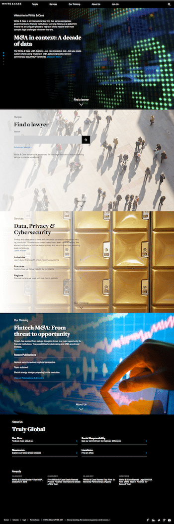 Global firm White & Case takes a different approach, incorporating several Hero images on its homepage, as you can see on the right below. This is less effective because the page is noisier and not nearly as easy to read.