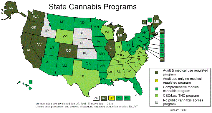 State laws for cannabis use and dispensing vary. According to the NCSL (National Conference of State legislators) as of June 24, 2019: