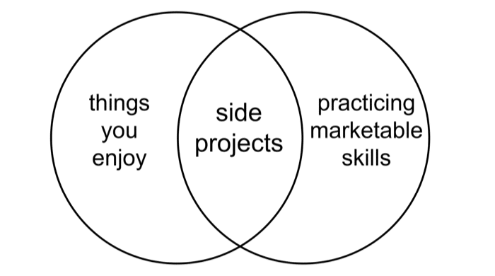 Side projects work best when they live at the interaction of ‘Things you enjoy’ and ‘Things that help you practice a marketable skill.’
