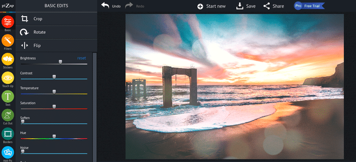 piZap is an easy-to-use online photo editor. It offers both Flash and HTML5 versions – a valuable asset on the now, largely post-Flash internet.