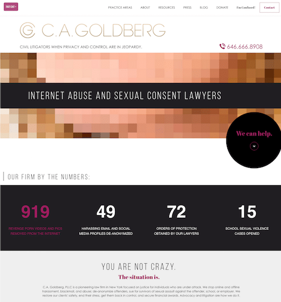 For example, take a look at how the C.A. Goldberg firm, a law firm focusing on internet abuse and sexual consent, uses counters as you scroll their page to give you a flavor of their successes, “by the numbers” (visit their page to see this live).