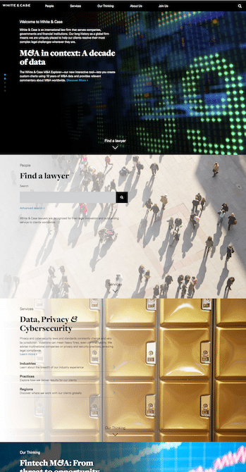Global firm White & Case takes a different approach, incorporating several Hero images on its homepage, as you can see below. This is less effective because the page is noisier and not nearly as easy to read.