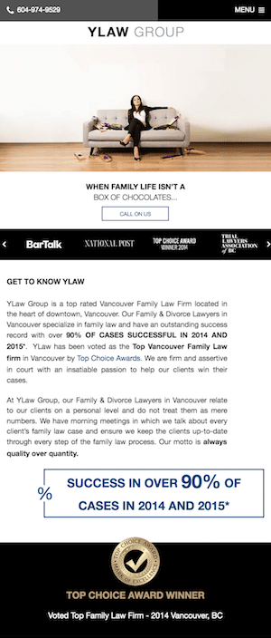 Below is the Ylaw Group site (discussed above) when viewed on a small screen. Notice how the menu is collapsed into what’s called a “hamburger menu” on the top right, and how the text and images adjust to the screen size.